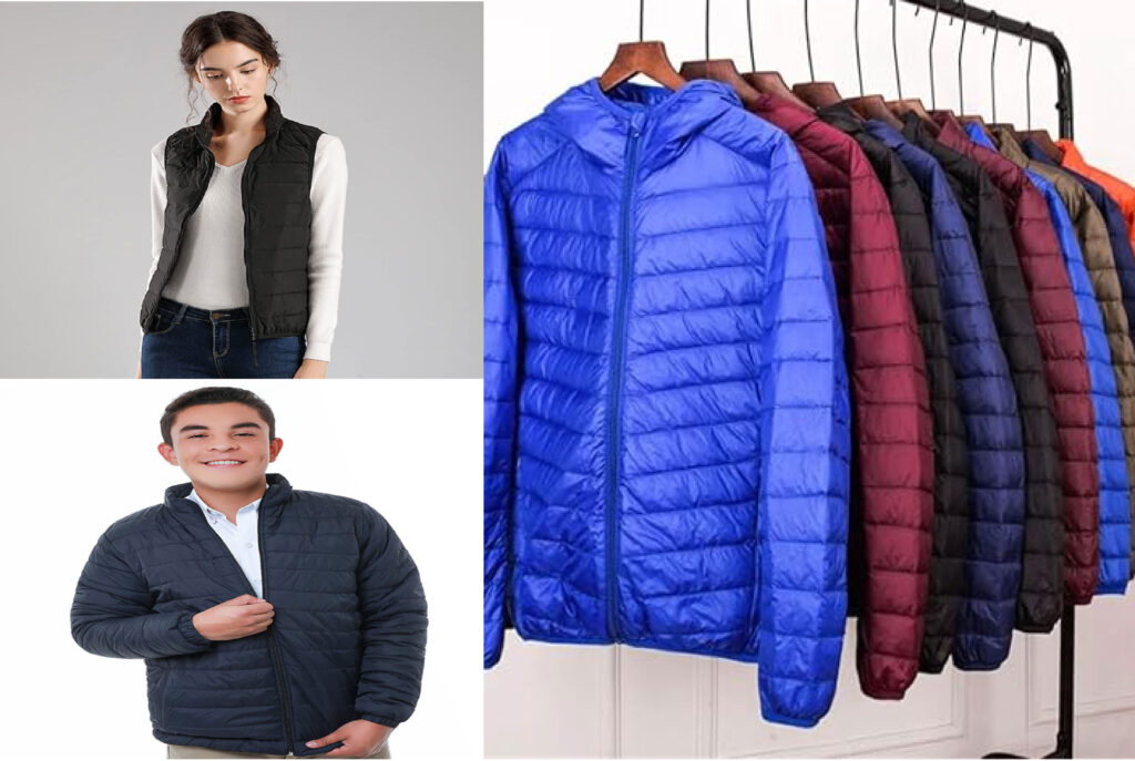 Chaquetas y chalecos en tela antifluido, acolchado en guata de 300 gramos, dos bolsillos exteriores con cremallera, un bolsillo interior de tapa, se pueden fabricar con capota.