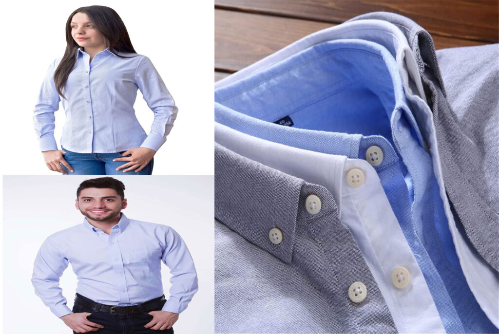 Camisa formal, cuello, pechera y puños fusionados, botones en nylon, la camisa de hombre lleva un bolsillo al frente y botones pisa cuello, la camisa de mujer es entallada y sin bolsillo. Opcion de materiales; Oxford y Dacron.
